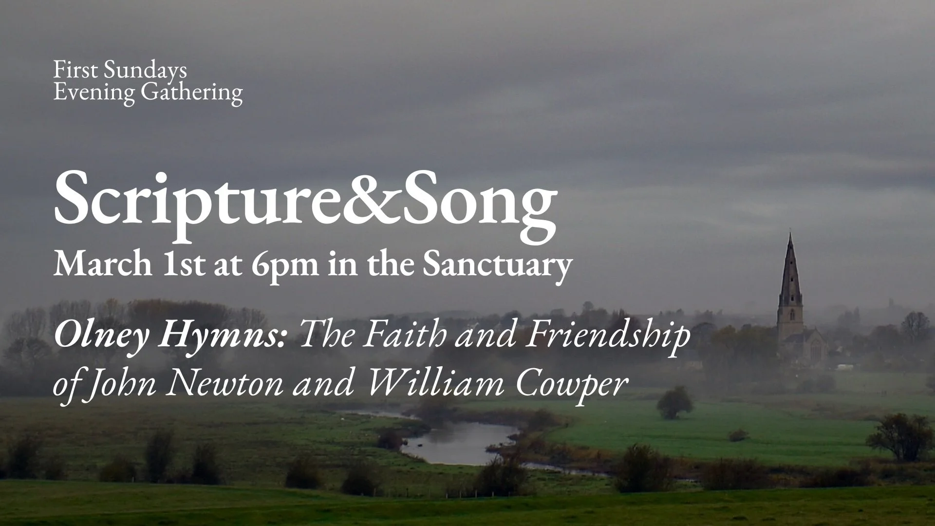 Scripture & Song: The Olney Hymns Sunday, March 1, 2026 6:00 PM 7:00 PM 18:00 19:00 Grace Church of DuPage 27W344 Galusha Avenue Warrenville, IL, 60555 United States (map) Google Calendar ICS Join us for this month's Scripture & Song on Sunday, March 1st, at 6pm, where we will be focused on the friendship and hymns of John Newton and William Cowper and how this relationship stands as a model for our persevering together in the faith.