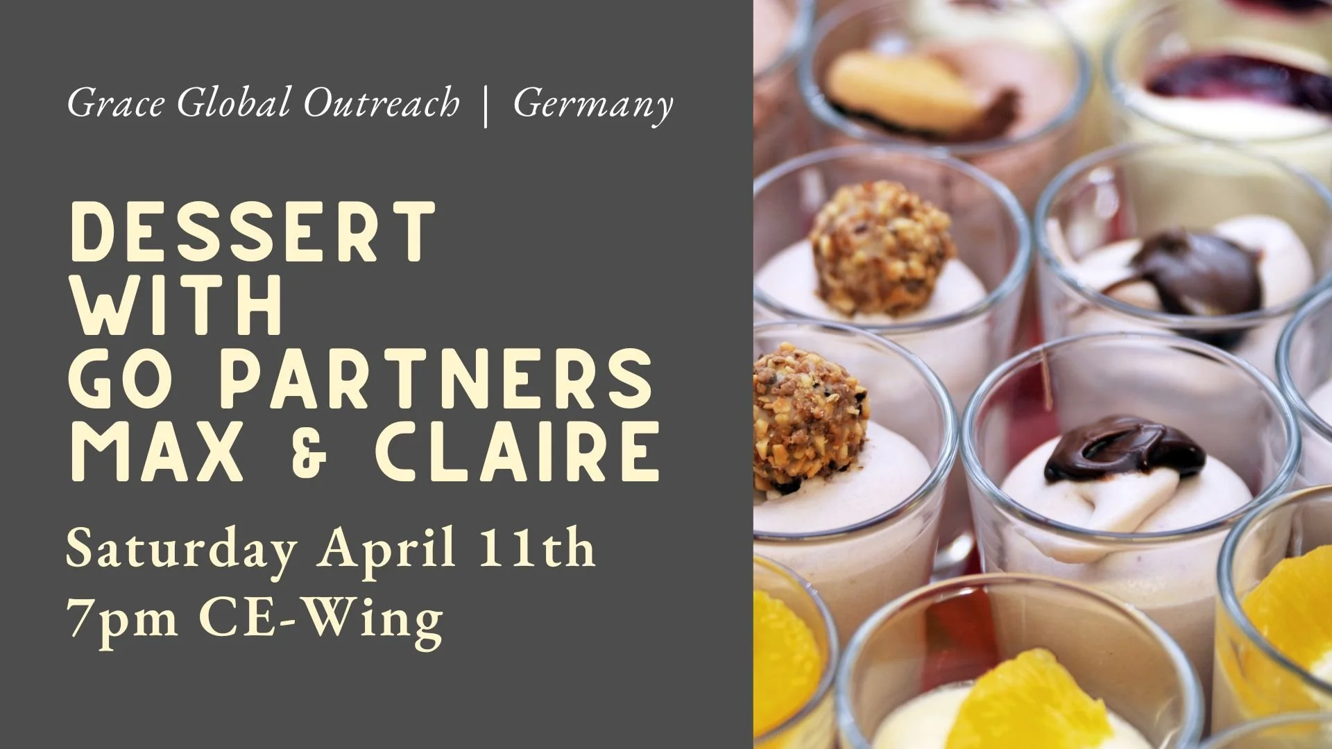 Join us on Saturday, April 11th, at 7pm in the CE wing for dessert with our global outreach partners, Max & Claire (Patty) Rothe.